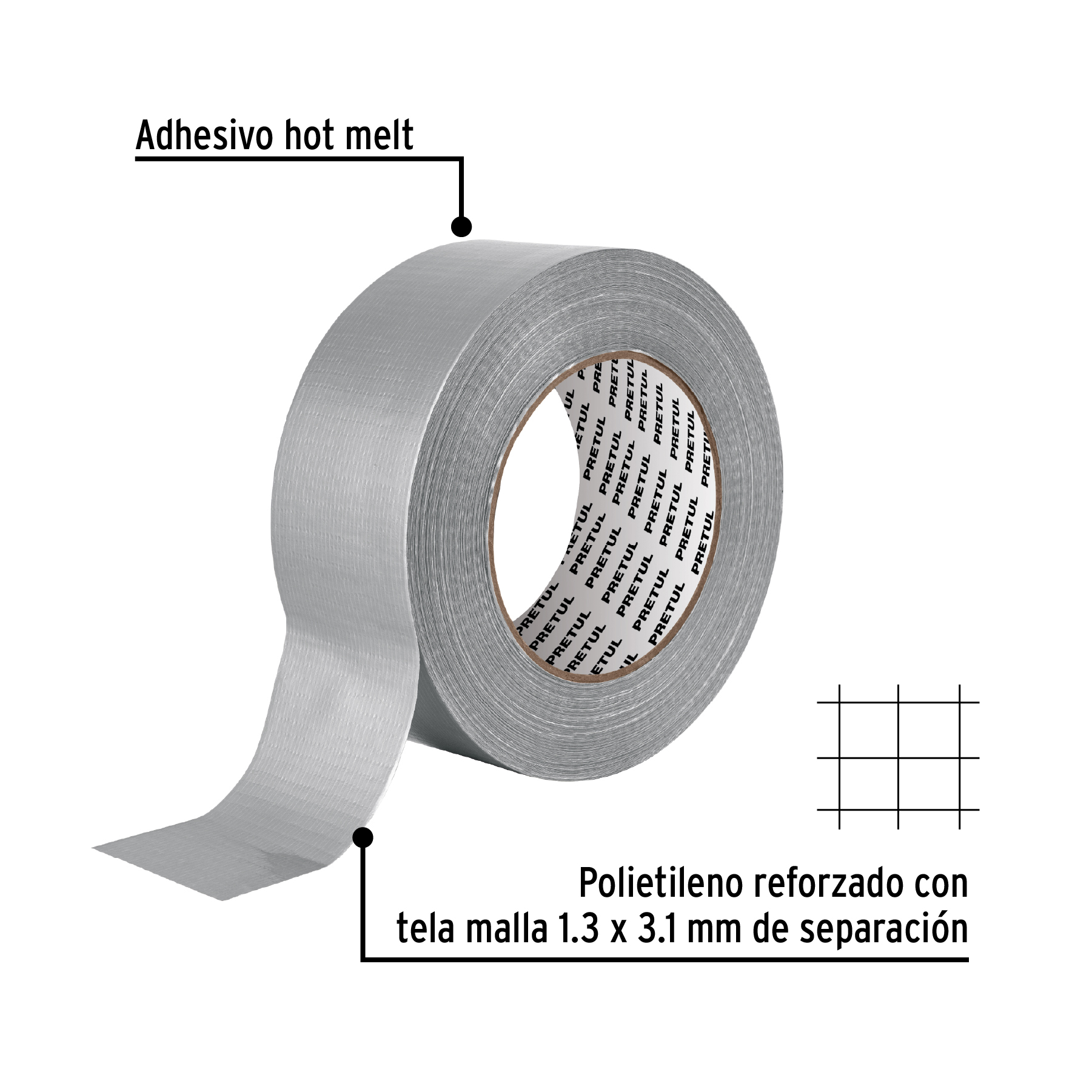 Cinta para ducto PRETUL de 50 metros de largo y 48 mm de ancho, con un espesor de 0.16 mm, ideal para trabajos de reparación y sellado. Está fabricada en polietileno reforzado con malla de algodón, lo que le brinda mayor resistencia y durabilidad. Cuenta con adhesivo hot melt que asegura una excelente fijación en diversas superficies.