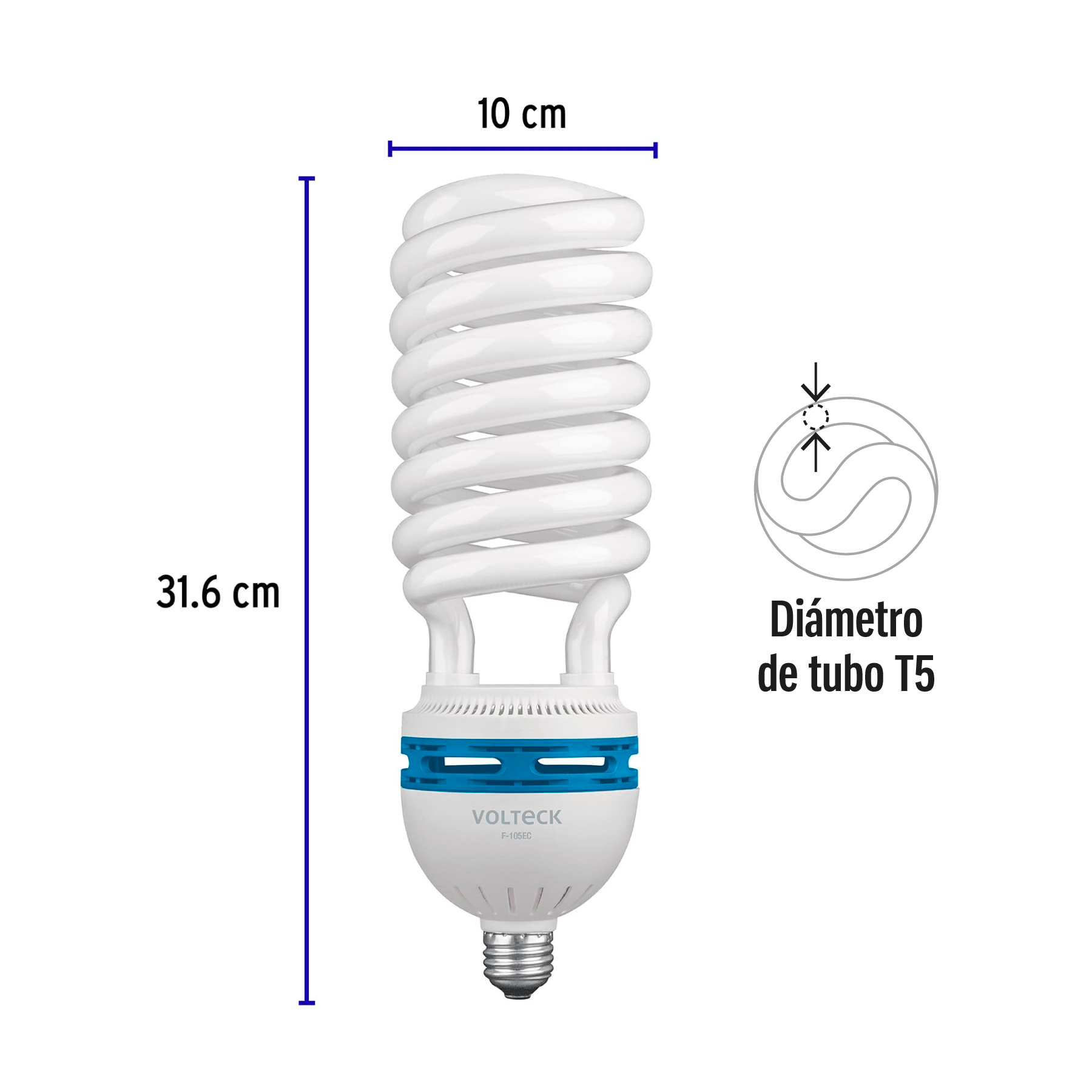 Lámpara fluorescente compacta espiral T5 de 105W con luz de día, que ofrece alto rendimiento y hasta 72% de ahorro energético. Cuenta con encendido instantáneo y brinda la misma iluminación que focos tradicionales, pero con menor consumo, sin ser compatible con dimmers.