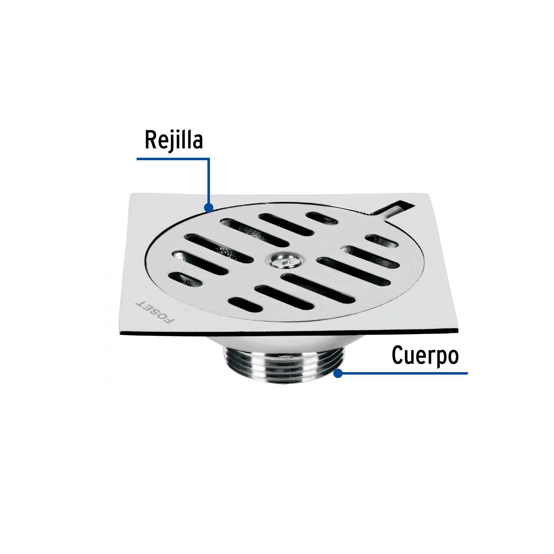 Resumidero cuadrado metálico de 4″ x 4″ marca FOSET, con cuerpo resistente y rejilla de acero inoxidable para mayor durabilidad.